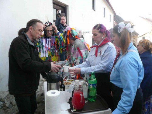 Masopuste, Masopuste, kohouta jsme sice nestínali (to už na mnohých místech udělaly orgány hygienické správy), zato jsme mohli nahlédnout do místní kovárny, kde ti nejmenší odvážlivci mohli pozvednout kladivo a zabušit si na kovadlině do rozžhaveného železa. Mezitím (podle dobové hantýrky) tiskový mluvčí zvoncem zazvonil na bytelné dveře sídla pana starosty ve farní budově a poté jej oslovil a požádal o vydání povolení ke koledě. Pan starosta, vyrušený z polední siesty, které se oddával se svou ženuškou, nejprve dosti rozmrzele váhal, ale po složení slibu o ukázněnosti při místních radovánkách svolil, povolení vydal. A jaký by to byl starosta, kdyby bez zaváhání nepozval k milému pohoštění?!